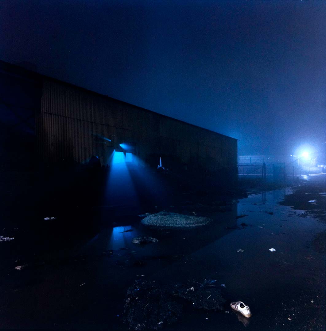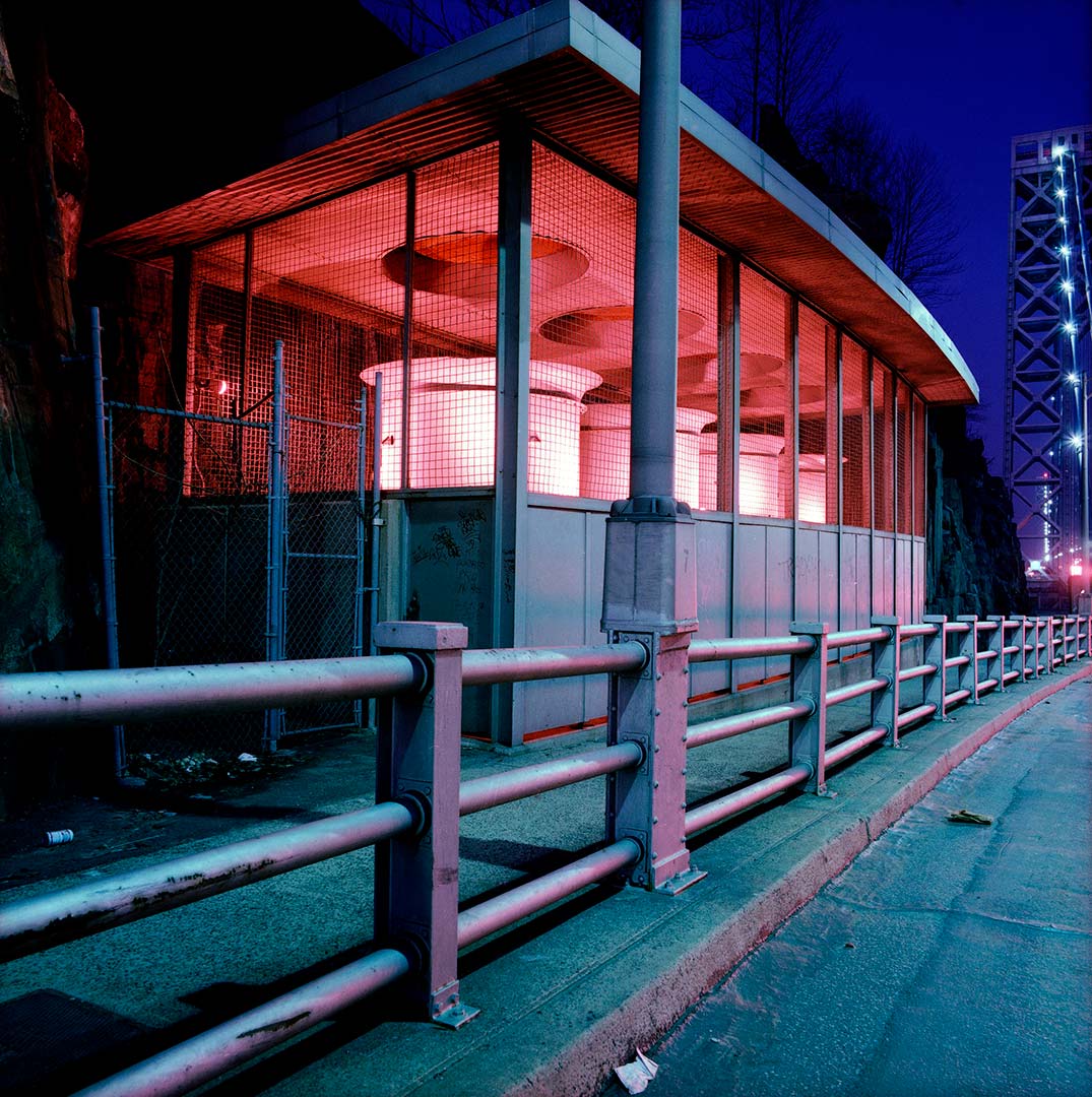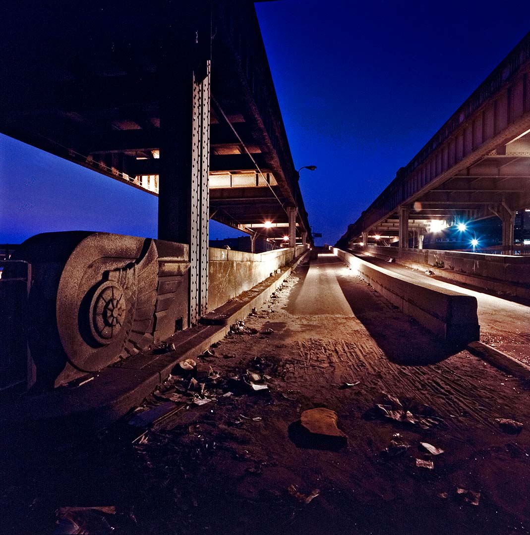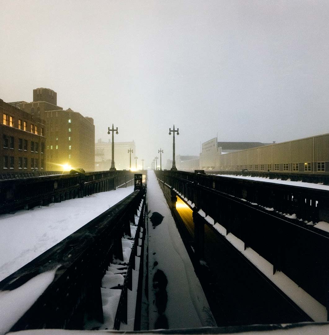 It is to these areas that I have long been drawn, lingering there to meditate on a quality of light, space and weather. In the decay and desertion of these run-down places, there is much for me to explore, and I find the atmosphere to be rich in mystery, reminiscent of a lost city. Early on, around 1976, I would head for the west side of lower Manhattan to explore the abandoned Miller Highway. On the vast expanses of that deteriorating roadway– better known as the West Side Highway– I found unblocked sunlight, an open horizon, and all varieties of weather. It is this spirit that I have branched out in my adventures, taking my camera to many other places in the New York area. The resulting images describe a transitory experience of atmosphere, where daylight, weather and artificial light combine in ethereal, otherworldly ways.